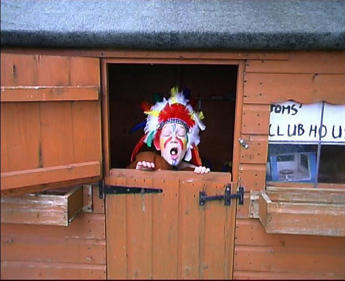 A split screen video, originally made for an installation as part of ‘Something Funny in the Woodshed’ touring show. One side three very young cowboys ‘face- off in triangular’ reservoir- dogs’ style with toy guns, and repeatedly all die and then re animate backwards to life, whilst on the other side we gradually approach an ‘Indian’ shut in a play house who covers his eyes peekaboo style rhythmically, repeatedly in a loop.