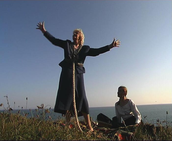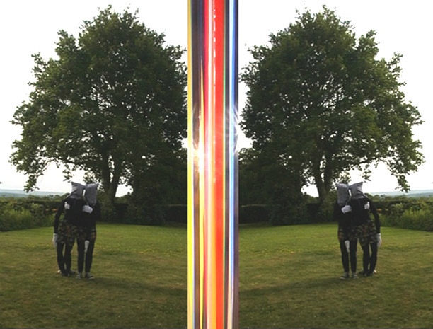 A hooded woman appears frame left carrying a stuffed dummy of herself- this is mirrored by what appears to be an identical image on the right, but the sync gradually decays. A mysterious rainbow like band of twinkling colour, that evokes a nostalgic sense of the sublime, runs down the centre of the frame, into and out of which the hooded characters (and a black cat) appear and disappear. On closer examination this band is made from plastic strip ‘fly’ curtains one might see in the doorways of seaside tea shops or adult video stores. These passages are punctuated by a love story between a ball of hair and a site specific sculpture.