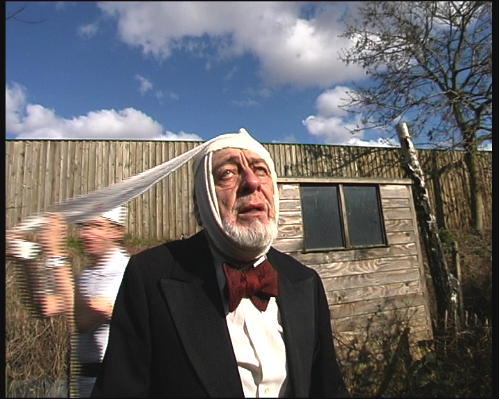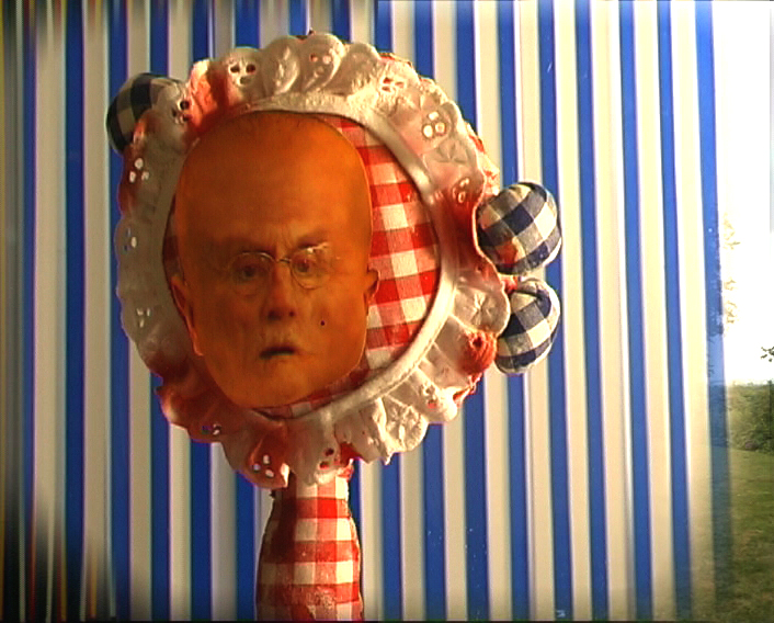A beaming Lady in evening dress drops a ceremonial ball, that reappears in the right had side of the split screen frame falling from the sky. It falls into a field, onto a man dressed in some kind of furry white ritual costume. He smashes the ball to smithereens with a ceremonial paddle. Each smash produces a flying puppet-doll like thing, that hits the camera to sporting cheers on the sound track – it’s given a ‘score’ on the screen. This verse and chorus like song structure elaborates into a fake painting competition whose logic is ‘explained’ by young children. With each new ‘smash-ball-puppet’ chorus the score rises, the face on the puppet changes from a baby to an old man…who periodically appears in another part of the video, as a confused guy in a residential care home.
