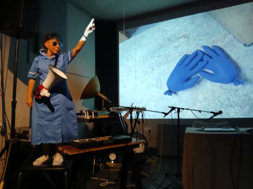 She wears things inside her head that she is not supposed to fiddle with, but she does fiddle, triggering collapses between the registers of her space inside the video and the live space of the audience where a fierce, wrong kind of Nurse (also played by Thomas) presides over a higher-level reality with megaphone, cryptic commentary and a casio keyboard. In a 3rd, parallel reality, a young woman (played by Lucia Coppola) is experimenting with a piece of automated weather that fell into her room. It might serve as a communication device between her and the older woman—but it soon gets out of hand…