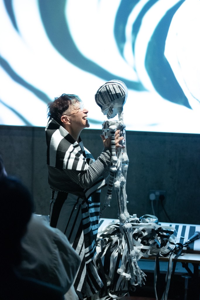 A frenetic performance of striped, coded beings enmeshed in a system that’s of their own making, yet out of their control. Chanted and spoken words, physical performance, costumes, electronic and live music, projected video with stop-frame animations. A defiant, DIY lament to toxic automation. Ambiguities and interference patterns are embraced, as is the contradiction of the toxic and the sublime, the comic and apocalyptic. Matt Rogers and Hugo Hagger