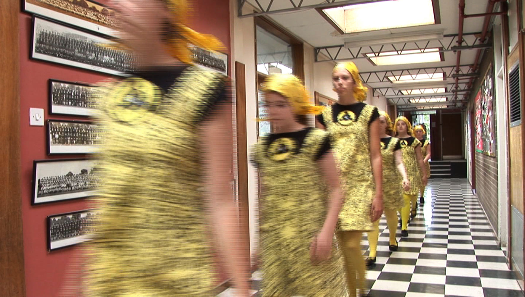 The Film is set in a fictional future-past-present and filmed in my old secondary school, a deteriorating Mid Century Modern comprehensive in an English New Town. In this parallel world, the students’ learning is bio-technically monitored through an ingested device. High-scoring pupils perform their learning through a rhythmic action practice that produces little white spheres – Units of Knowing –the currency through which the new economy functions. The narrative of the film takes us through a day in the life of the New Girl, who, in trying to question the barrage of strange, yet oddly familiar ordeals (like Alice in Wonderland) causes the complex system of this parallel world to collapse.
